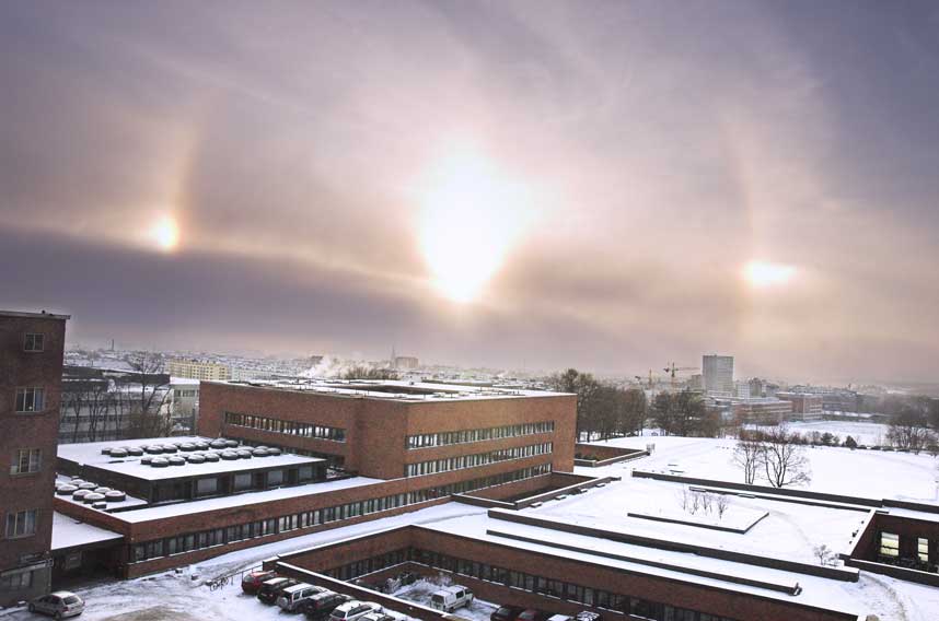 looks like three suns shining down. It's ice crystals up in the troposphere breaking the sunlight that does it. Pretty neat, eh? And meanwhile, the setting sun is making the snow almost look faint purple here. Beautiful.